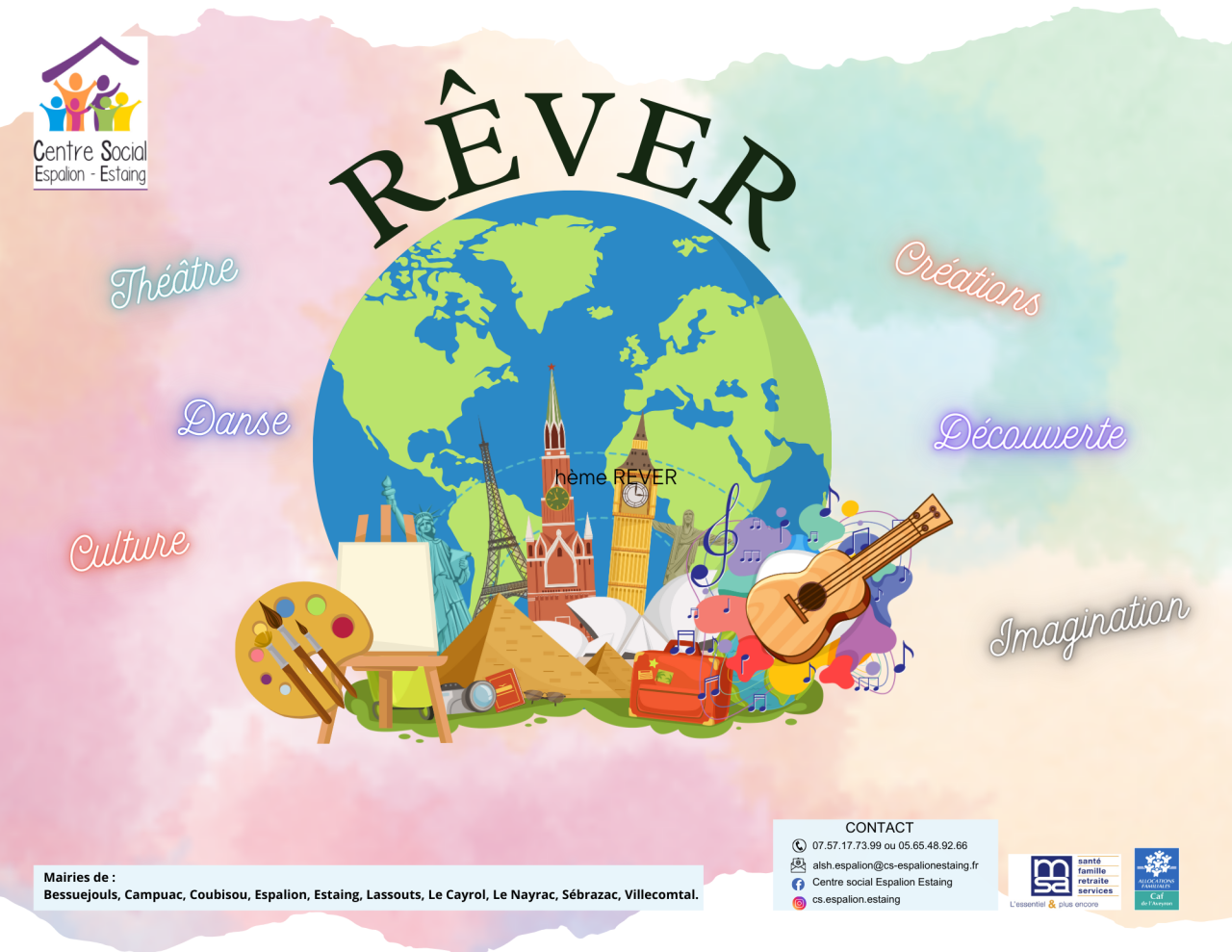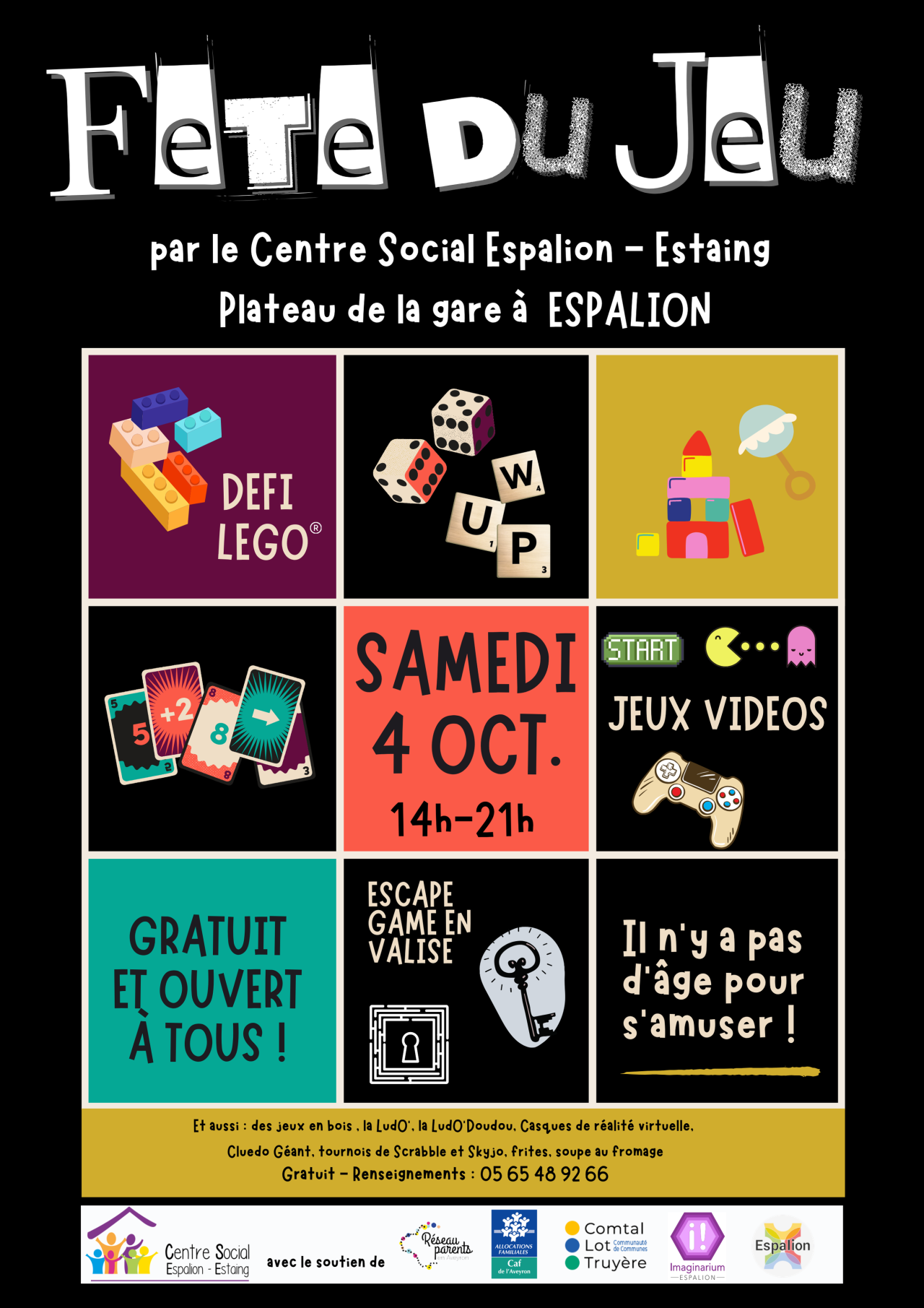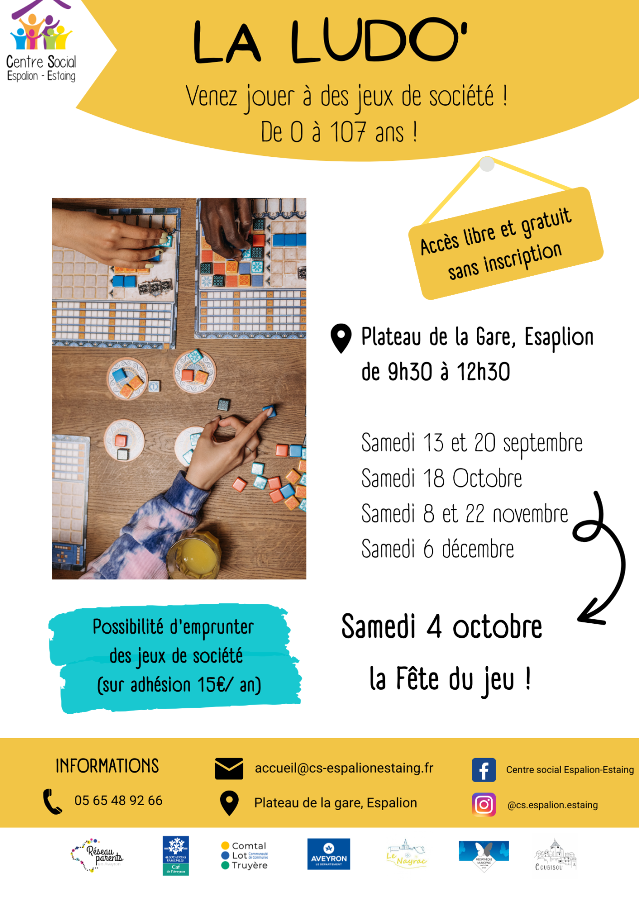 Les animations à vivre en FamilleParents & EnfantsEspaces d’Accueil Parents/Enfants : La LudO’Doudou, La LudO’Les ateliers Parents – Enfants Les animations des 3-12 ansEnfance & JeunesseL’Accueil de LoisirsL’espace JeunesLes camps d’étéLes activités périscolaires Les animations de Vie SocialeTout public& SéniorsLa LudO’Créa Les Rendez-vous en CuisineLes LudO’Les projets d’Initiatives et Solidaires Les servicesAccueil & PermanencesLa mission d’accueil du Centre Social Rendez-vous avec l’ADAVEM et Le Point Info Séniors Actions parentalité Les Rendez-vous des ParentsLes Cafés-ParentsParents, parlons-en !Parents, nouveaux nés La ludothèqueLes Jeux de la LudO’TakeLe service itinérant d’emprunt de jeux L’actu du Centre Social Ateliers Nature Programme ExplO’ Programme LoupiO’ Fête du jeu La LudO’ : prochaines dates Semaine « les Sens en éveil » Du 21 au 24 juillet, la semaine « Eveil des sens », au Foirail d’Espalion… LudO’Plein Air La LudO’Plein Air, c’est un espace de jeux pour toutes et tous de 0 à… Programme des Côm’plices Charger plus En cours de chargement… Vous avez atteint la fin de la liste Partager :TwitterFacebookWhatsApp
