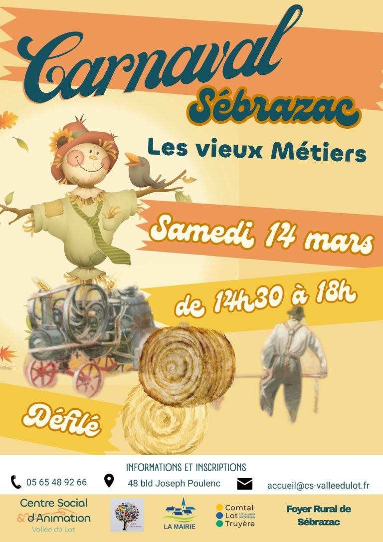 Le Centre Social & d’Animation Vallée du Lot, en partenariat avec la commune de Sébrazac, l’Association des Parents d’Élèves (APE) de l’école et le foyer rural, organise un carnaval le samedi 14 mars à Sébrazac sur le thème des vieux métiers, avec un accent sur l’intergénérationnel ! Un programme riche en animations attend petits et grands pour une journée festive placée sous le signe de la convivialité et du partage !